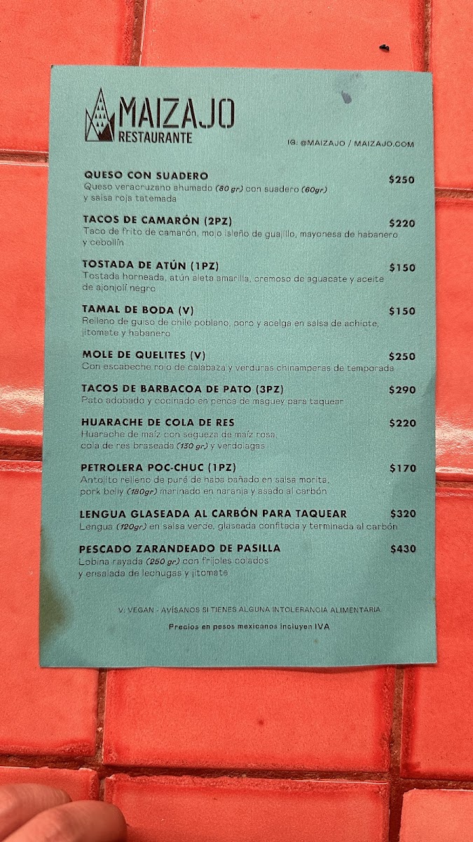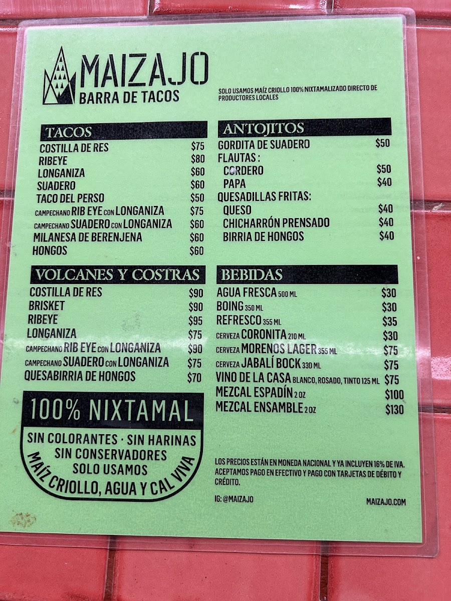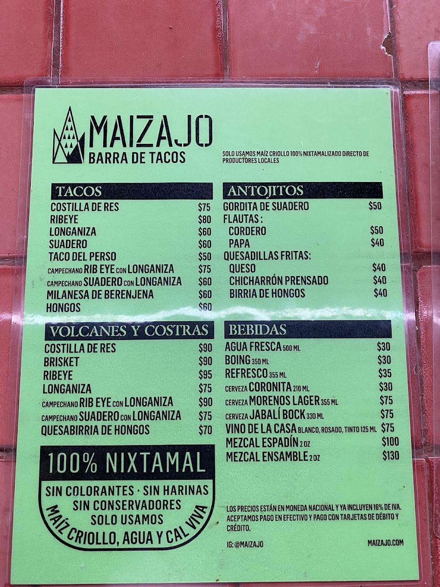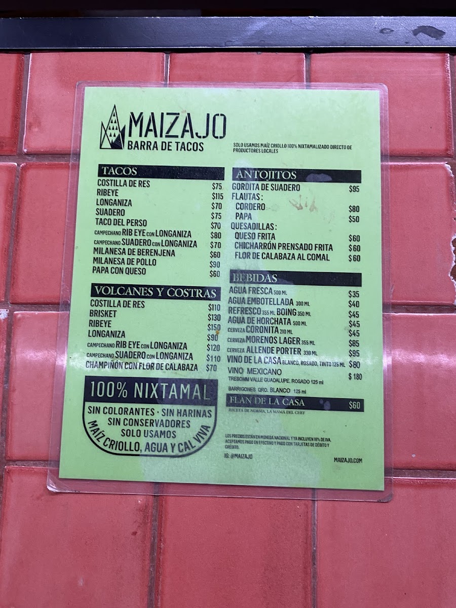 Introducing Maizajo, a vibrant eatery nestled in the heart of Ciudad de Mexico. This dining destination uniquely blends a lively taqueria experience downstairs with an elevated restaurant atmosphere upstairs. Guests are welcomed to leave their name upon arrival, choosing between the casual taco bar or the more refined, sit-down service.